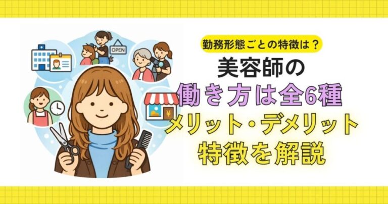 この記事では、美容師の代表的な勤務形態を6パターンに整理し、それぞれの特徴・収入イメージ・メリット・デメリットを解説します。 ご自分のライフスタイル(子育て、ダブルワーク、キャリア志向、独立志向など)に合う働き方を見つけ … 続きを読む 美容師の働き方は6種類!勤務形態ごとの特徴やメリット・デメリットを解説