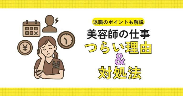 美容師は華やかに見える一方で、長時間労働や体力負担、人間関係など多くのストレス要因が重なりやすい職業です。 本記事では、「美容師として働くのがつらい」と悩む方に向けて、辞めたいと感じる主な理由・働き方を改善する方法・環境 … 続きを読む 美容師の仕事がつらい理由・対処法|退職のポイントも解説